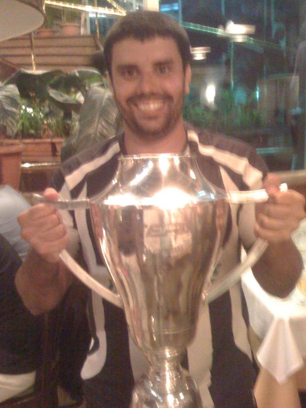 Cesar, quem estava bêbado era o Roxo. A taça estava cheinha de chopp e ele a devolveu vazia. Ela deve caber bem uns 10 litros já que ele reclamou do seu peso. Para tirar a foto teve que beber todo seu conteúdo para não pesar na foto, o resultado foi esse embaçamento todo.